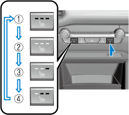 При каждом нажатии выключателя электрического обогревателя сиденья заданная температура изменяется, как показано на рисунке.
