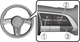 Уменьшение дистанции между автомобилями выполняется нажатием выключателя CANCEL вниз. Увеличение дистанции между автомобилями выполняется нажатием выключателя CANCEL вверх.