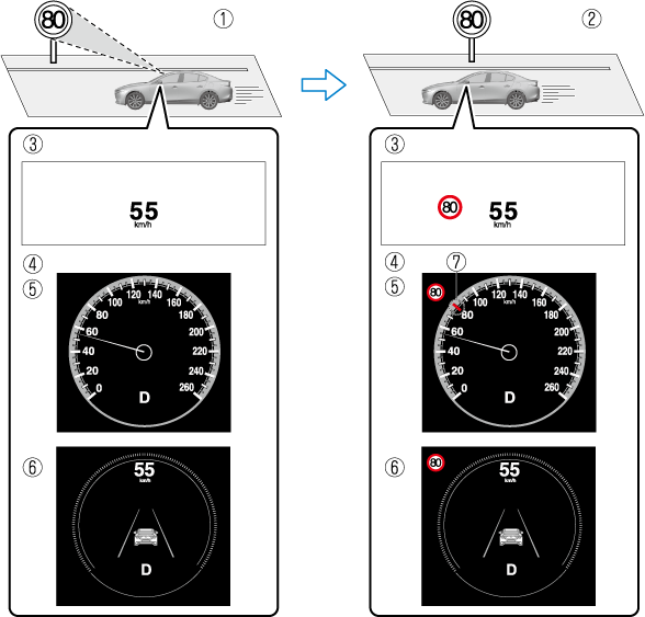 Если скорость автомобиля превышает значение, указанное на знаке ограничения максимальной скорости, который отображается на активном водительском дисплее / комбинации приборов во время движения, система уведомляет водителя при помощи индикации на активном водительском дисплее / комбинации приборов и предупреждающего звукового сигнала.