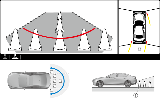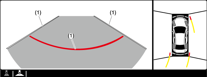 Экран вида сверху / широкоугольного вида сзади показывает изображение пространства сзади автомобиля с широким углом обзора и корректирует изображение для помощи в обнаружении препятствия, приближающегося сбоку. Поэтому это изображение отличается от реального вида.