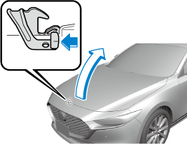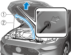 Возьмитесь за накладку опорной стойки и закрепите её в отверстии для стойки, указанном стрелкой, чтобы зафиксировать капот в открытом положении.