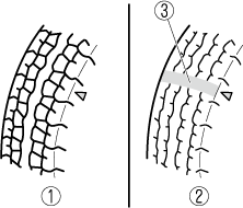 При равномерном износе шины появляется индикатор износа в виде сплошной полосы, проходящей поперёк протектора.