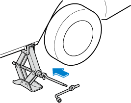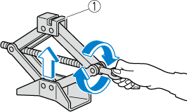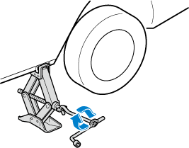Используя колёсный ключ, как рукоятку, вращайте винт домкрата по часовой стрелке и поднимите автомобиль на высоту, достаточную для установки запасного колеса. Перед тем как отворачивать колёсные гайки, убедитесь в том, что автомобиль находится в устойчивом положении и не может упасть с домкрата или самопроизвольно сдвинуться с места.